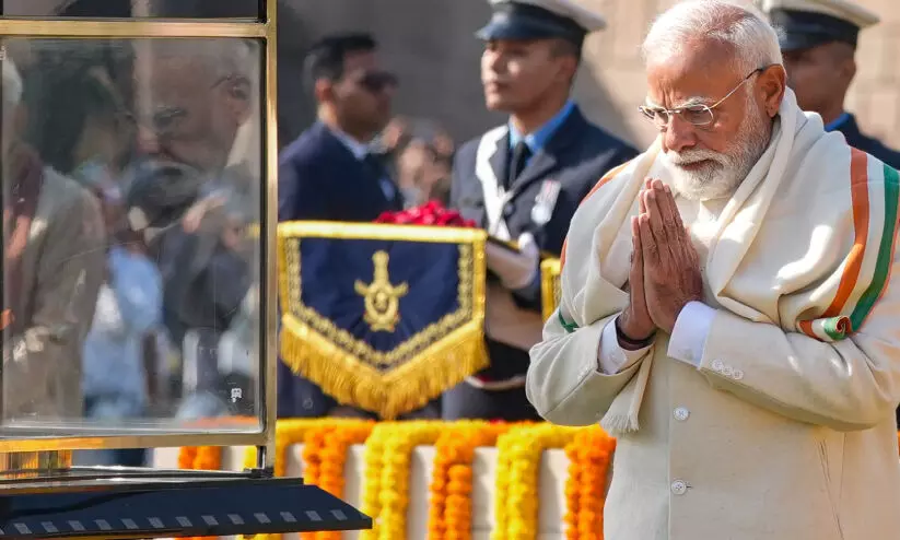 രക്തസാക്ഷി ദിനത്തിൽ രാഷ്ട്രപിതാവ് മഹാത്മാ ഗാന്ധിക്ക് രാജ്ഘട്ടിൽ പ്രധാനമന്ത്രി നരേന്ദ്ര മോദി ആദരമർപ്പിക്കുന്നു