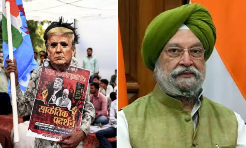 ജയ്പൂരിലെ ഷഹീദ് സ്മാരകിൽ എപ്സ്റ്റീൻ ഫയൽസ് വിവാദത്തിൽ പ്രധാനമന്ത്രി നരേന്ദ്ര മോദിക്കെതിരെ നടന്ന പ്രതീകാത്മക പ്രതിഷേധത്തിനിടെ യു.എസ് പ്രസിഡന്റ് ഡോണൾഡ് ട്രംപിന്റെ മുഖംമൂടിയണിഞ്ഞ നാഷണൽ സ്റ്റുഡന്റ്സ് യൂണിയൻ ഓഫ് ഇന്ത്യ പ്രവർത്തകൻ, ഹർദീപ് സിങ് പുരി