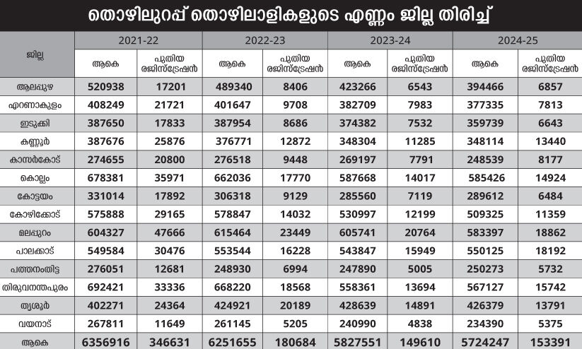 2021-22ൽ 3.47 ലക്ഷം പേർ രജിസ്റ്റർ ചെയ്തിരുന്നത് നാലുവർഷത്തിനിപ്പുറം 1.53 ലക്ഷമായി കുറഞ്ഞു. ഏറ്റവും കൂടുതൽ തൊഴിലുറപ്പ് തൊഴിലാളികളുള്ള തിരുവനന്തപുരം ജില്ലയിലാണ് വലിയ കൊഴിഞ്ഞുപോക്ക്. നാലുവർഷത്തിനിടെ ഇവിടെ ഒന്നേ കാൽ ലക്ഷം പേർ പണിയുപേക്ഷിച്ചു.