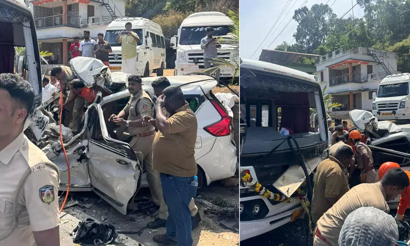 നാലുപേർ സഞ്ചരിച്ച കർണ്ണാടക രജിസ്ട്രേഷനുള്ള എർട്ടിഗ കാർ തമിഴ്നാട്ടിൽനിന്ന് വന്ന മിനിബസിലേക്ക് ഇടിച്ചുകയറുകയായിരുന്നു. കാർ തകർന്ന് തരിപ്പണമായി. ഒരാൾ തൽക്ഷണം മരണപ്പെട്ടു. പൊലീസും ഫയർ ഫോഴ്സും ചേർന്ന് വാഹനം വെട്ടിപൊളിച്ചാണ് മരിച്ച ആളെ പുറത്തെടുത്തത്.