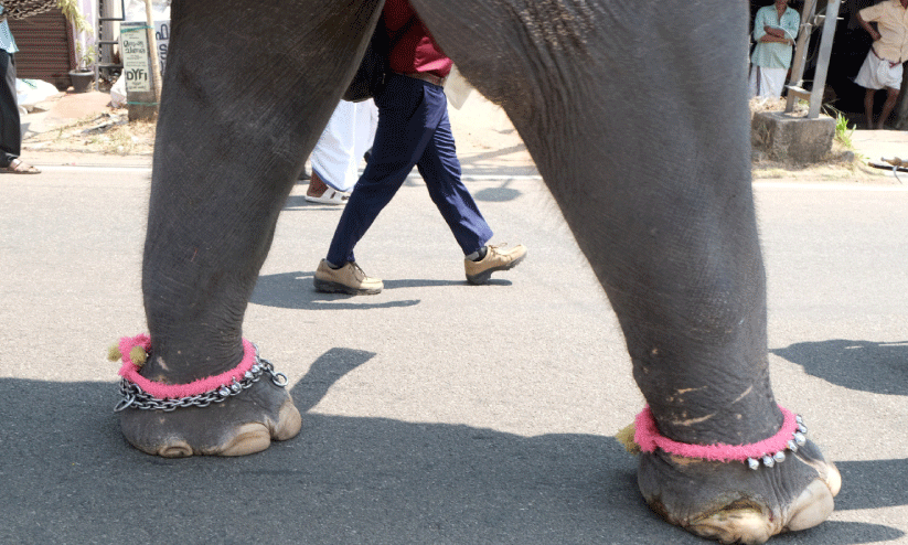 നടത്തികൊണ്ടു പോകുന്ന ആന. നാട്ടാന പരിപാലന നിയമങ്ങൾ കർക്കശമാണെങ്കിലും