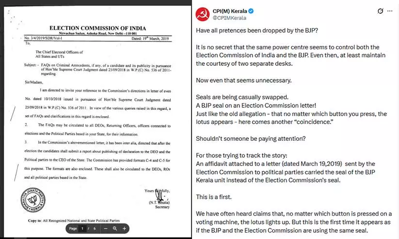 2019 മാർച്ച് 19-ന് തെരഞ്ഞെടുപ്പ് കമ്മീഷൻ വിവിധ രാഷ്ട്രീയ പാർട്ടികൾക്ക് അയച്ച കത്തിനൊപ്പമുള്ള സത്യവാങ്മൂലത്തിലാണ് ബിജെപി കേരള ഘടകത്തിന്റെ സീൽ പതിപ്പിച്ചിരിക്കുന്നത്. തെരഞ്ഞെടുപ്പ് കമ്മീഷന്റെ സീലിന് പകരം ബിജെപിയുടേത് വന്നത് വെറുമൊരു 'യാദൃശ്ചികത'യായി തള്ളിക്കളയാനാവില്ലെന്ന് സി.പി.എം ആരോപിക്കുന്നത്.