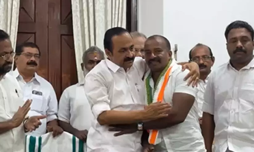 സി.പി.എം രക്തസാക്ഷി വിഷ്ണുവിന്റെ സഹോദരൻ വിനോദിനെ പ്രതിപക്ഷ നേതാവ് വി.ഡി.സതീശൻ ഷാൾ അണിയിച്ച് സ്വീകരിക്കുന്നു