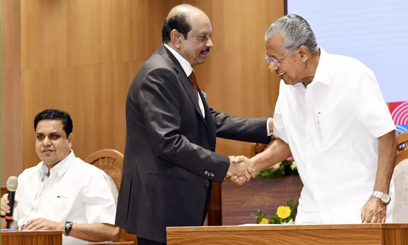 ലോക കേരളസഭയുടെ പ്രതിനിധി സമ്മേളനത്തിനെത്തിയ മുഖ്യമന്ത്രി പിണറായി വിജയനും നോർക്ക വൈസ് ചെയർമാൻ എം.എ.യൂസഫലിയും ഹസ്തദാനം ചെയ്യുന്നു. സ്പീക്കർ എ.എൻ ഷംസീർ സമീപം