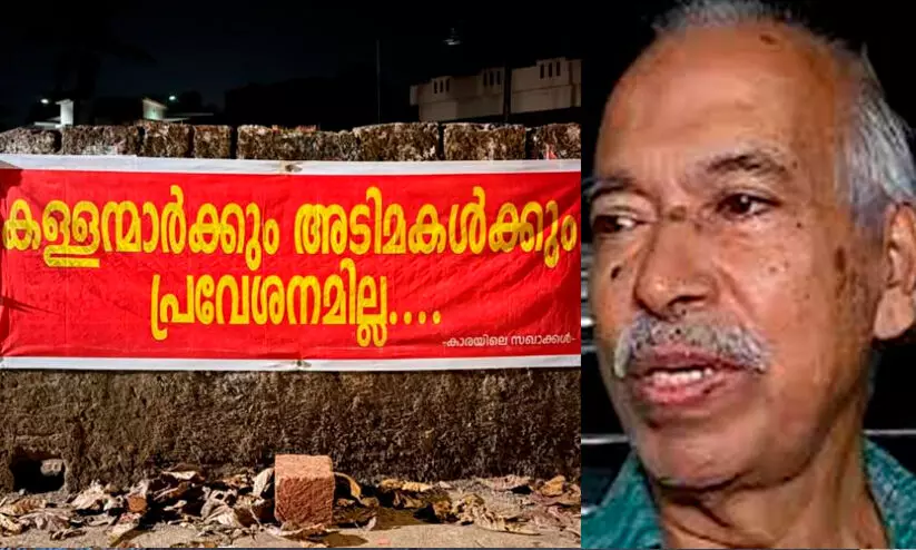 കണ്ണൂർ: രക്ത സാക്ഷി ഫണ്ട് തട്ടിപ്പുമായി ബന്ധപ്പെട്ട വെളിപ്പെടുത്തലിന്റെ പേരിൽ സി.പി.ഐ.എം പുറത്താക്കിയ വി. കുഞ്ഞി കൃഷ്ണന് പിന്തുണ പ്രഖ്യാപിച്ച് കണ്ണൂരിൽ ഫ്ലക്സ് ബോർഡുകൾ.'കാരയിലെ സഖാക്കൾ' എന്ന പേരിലാണ് ബോർഡുകൾ സ്ഥാപിച്ചിട്ടുള്ളത്. കള്ളൻമാർക്കും അടിമകൾക്കും പ്രവേശനമില്ല എന്നാണ് എഴുതിയിരിക്കുന്നത്.