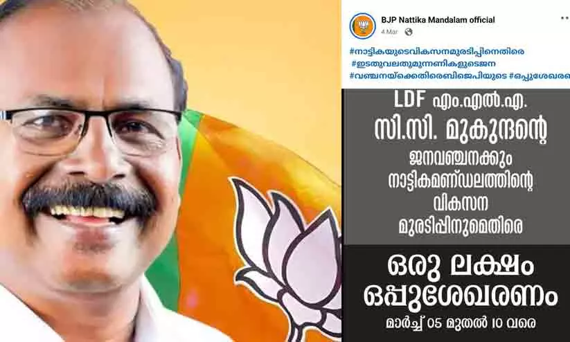 നാട്ടിക : നിയമസഭാ തെരഞ്ഞെടുപ്പിനുള്ള ബി.ജെ.പിയുടെ 39 അംഗ രണ്ടാം ഘട്ട സ്ഥാനാർഥി പട്ടിക കേന്ദ്ര നേതൃത്വം പുറത്തുവിട്ടപ്പോൾ നാട്ടികയിൽ സി.സി മുകുന്ദനാണ് സ്ഥാനാർഥി. നിലവിൽ നാട്ടികയിലെ എം.എൽ.എ ആയിരുന്ന മുകുന്ദൻ സി.പി.ഐ യുമായി ഇടഞ്ഞാണ് ബി.ജെ.പി പാളയത്തിലെത്തിയത്. എന്നാൽ ഇപ്പോൾ ചർച്ചയാകുന്നത് ബി.ജെ.പി നാട്ടിക മണ്ഡലം കമ്മിറ്റിയുടെ ഫേസ്ബുക്ക് പേജിലെ പോസ്റ്ററാണ്. കഴിഞ്ഞ മാർച്ച് നാലിന് പുറത്തിറക്കിയ പോസ്റ്ററിൽ സ്ഥലം എം.എൽ.എയായ മുകുന്ദനെതിരെ ഒരു ലക്ഷം ഒപ്പുശേഖരണം നടത്തുന്ന വാർത്തയായിരുന്നു. മാർച്ച് 5 മുതൽ 10 വരെയായിരുന്നു ഒപ്പുശേഖരണം. എന്നാൽ ഒപ്പുശേഖരണം കഴിഞ്ഞ് 10 ദിവസം തികയും മുമ്പ് ഇതേയാൾക്കുവേണ്ടി ജയ് വിളിക്കേണ്ട ദുരവസ്ഥയാണ് നാട്ടികയിലെ ബി.ജെ.പി പ്രവർത്തരുടേത്. പോസ്റ്ററും എം.സി മുകുന്ദന്റെ ചിത്രവും ഇതിനകം സോഷ്യൽ മീഡിയയിൽ ട്രോളായി മാറിയിട്ടുണ്ട്. ഇന്നലെ വരെ അഴിമതിയും വികസന മുരടിപ്പും ആരോപിച്ച് ഒപ്പിട്ട് പ്രതിഷേധിച്ചവർക്ക് തന്നെ ഇന്ന് മുകുന്ദന്റെ പോസ്റ്റർ ഒട്ടിക്കേണ്ടി വരുന്ന അവസ്ഥയാണ്.