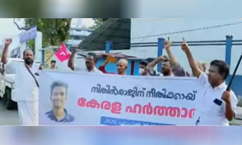 കൊച്ചി: അഞ്ചരക്കണ്ടി ഡെന്റൽ കോളജ് ബി.ഡി.എസ് വിദ്യാർഥി നിതിൻ രാജിന്റെ മരണത്തിൽ, വിവിധ ദലിത് സംഘടനകളും നിതിൻ രാജ് ആക്ഷൻ കൗൺസിലും ആഹ്വാനം ചെയ്ത ഹർത്താലിൽ സംസ്ഥാനവ്യാപകമായി വാഹനങ്ങൾ തടഞ്ഞു. ആദ്യമണിക്കൂറുകളിൽ തിരുവനന്തപുരം തമ്പാനൂർ, നെടുമങ്ങാട്, കഴക്കൂട്ടം, കണിയാപുരം, കണ്ണൂർ, കോഴിക്കോട്, ജില്ലയുടെ വിവിധ ഭാഗങ്ങൾ, കൊല്ലം, തൊടുപുഴ എന്നിവിടങ്ങളിൽ കെ.എസ്.ആർ.ടി.സി ബസുകളും കാറുകളടക്കമുള്ള വാഹനങ്ങളും തടഞ്ഞു. കെ.എസ്.ആർ.ടി.സി ഡിപ്പോകൾ കേന്ദ്രീകരിച്ച് ഹർത്താൽ അനുകൂലികൾ പ്രതിഷേധിച്ചു. ചിലയിടത്ത് പൊലീസ് ഇടപെട്ട് വാഹനങ്ങൾ കടത്തിവിട്ടു. ഇന്ന് രാവിലെ ആറു മുതൽ വൈകിട്ട് ആറുവരെയാണ് ഹർത്താൽ.