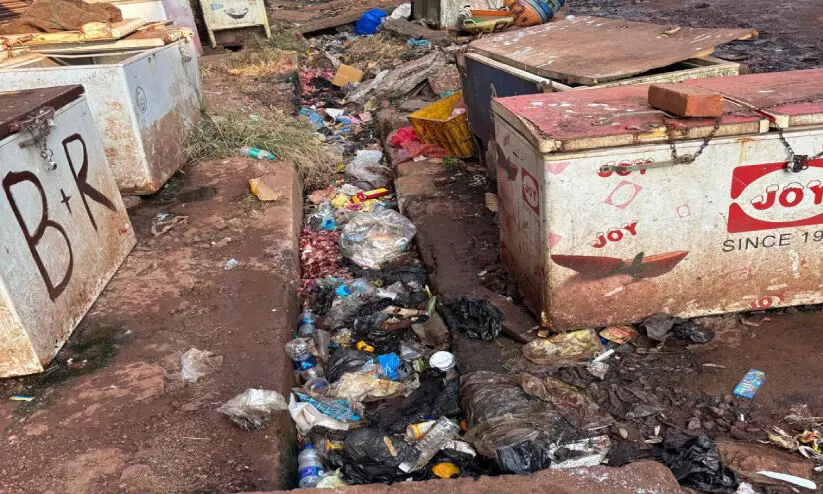 കുമ്പള മത്സ്യമാർക്കറ്റിനരികിലെ ഓവുചാലിൽ മാലിന്യം തള്ളിയനിലയിൽ