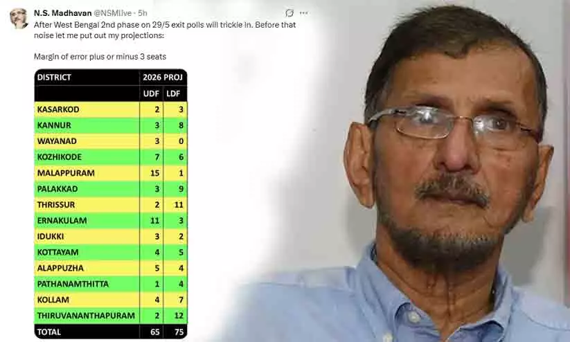 എന്.എസ്.മാധവന്റെ പ്രവചനം: കാസര്കോട്– യുഡിഎഫ് 2, എല്ഡിഎഫ് 3, കണ്ണൂര്– യുഡിഎഫ് 3, എല്ഡിഎഫ് 8, വയനാട്– യുഡിഎഫ് 3, എല്ഡിഎഫ് 0, കോഴിക്കോട്– യുഡിഎഫ് 7, എല്ഡിഎഫ് 6, മലപ്പുറം– യുഡിഎഫ് 15, എല്ഡിഎഫ് 1, പാലക്കാട്– യുഡിഎഫ് 3, എല്ഡിഎഫ് 9, തൃശൂര്– യുഡിഎഫ് 2, എല്ഡിഎഫ് 11, എറണാകുളം– യുഡിഎഫ് 11, എല്ഡിഎഫ് 3, ഇടുക്കി– യുഡിഎഫ് 3, എല്ഡിഎഫ് 2, കോട്ടയം– യുഡിഎഫ് 4, എല്ഡിഎഫ് 5, ആലപ്പുഴ– യുഡിഎഫ് 5, എല്ഡിഎഫ് 4, പത്തനംതിട്ട– യുഡിഎഫ് 1, എല്ഡിഎഫ് 4, കൊല്ലം– യുഡിഎഫ് 4, എല്ഡിഎഫ് 7, തിരുവനന്തപുരം– യുഡിഎഫ് 2, എല്ഡിഎഫ് 12.