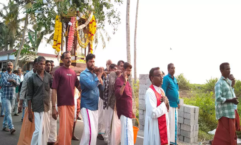 പള്ളിയുടെ തിരുനാൾ മഹോത്സവവുമായി ബന്ധപ്പെട്ട് നടന്ന തിരുരൂപം എഴുന്നള്ളത്തിൽ രൂപക്കൂട് ചുമലിലേറ്റി പോകുന്ന ഹൈന്ദവ വിശ്വാസികൾ