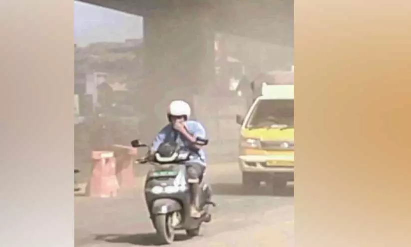 ദേശീയപാതയിൽ പൊടിപടലങ്ങൾക്കിടയിലൂടെ ബൈക്ക്