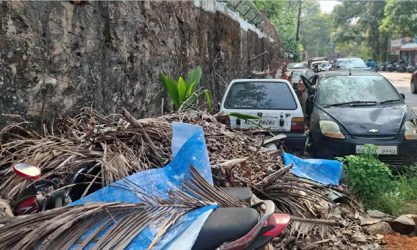 തൃക്കാക്കര പൊലീസ് സ്റ്റേഷനു മുന്നിലെ പൊതുനിരത്ത് കേസിൽപ്പെട്ട വാഹനങ്ങൾ കൈയടക്കിയിരിക്കുന്നു. ഇരുചക്രവാഹനങ്ങൾക്ക് മുകളിൽ കരിയിലകൾ കൂട്ടിയിട്ടിരിക്കുന്നതും കാണാം