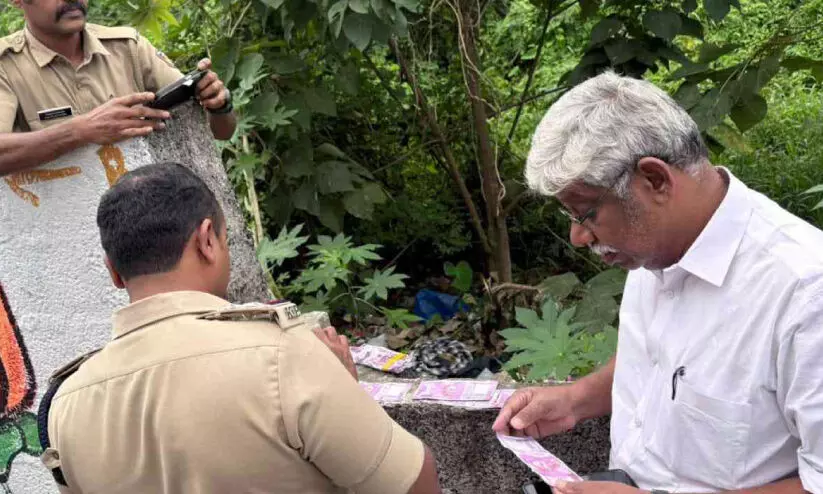 കാക്കനാട് പാലച്ചുവടിലെ ഒഴിഞ്ഞ പറമ്പിൽ കാണപ്പെട്ട ഡമ്മി നോട്ടുകെട്ടുകൾ പൊലീസ് പരിശോധിക്കുന്നു. വാർഡ് കൗൺസിലർ നൗഷാദ് പല്ലച്ചി സമീപം