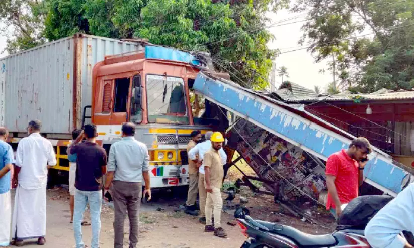 നിയന്ത്രണംവിട്ട ലോറി ബസ് കാത്തിരിപ്പ് കേന്ദ്രത്തിലേക്ക് ഇടിച്ചുകയറിയപ്പോൾ