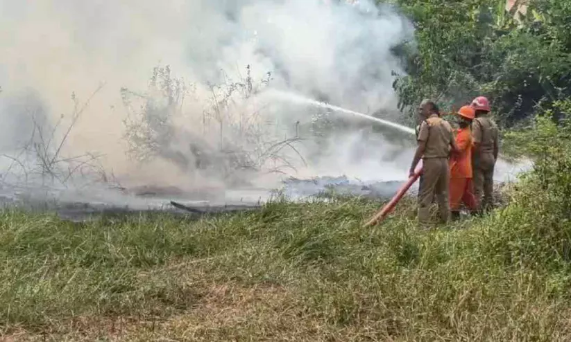 ഫയർഫോഴ്സ് സംഘം തീ അണക്കുന്നു