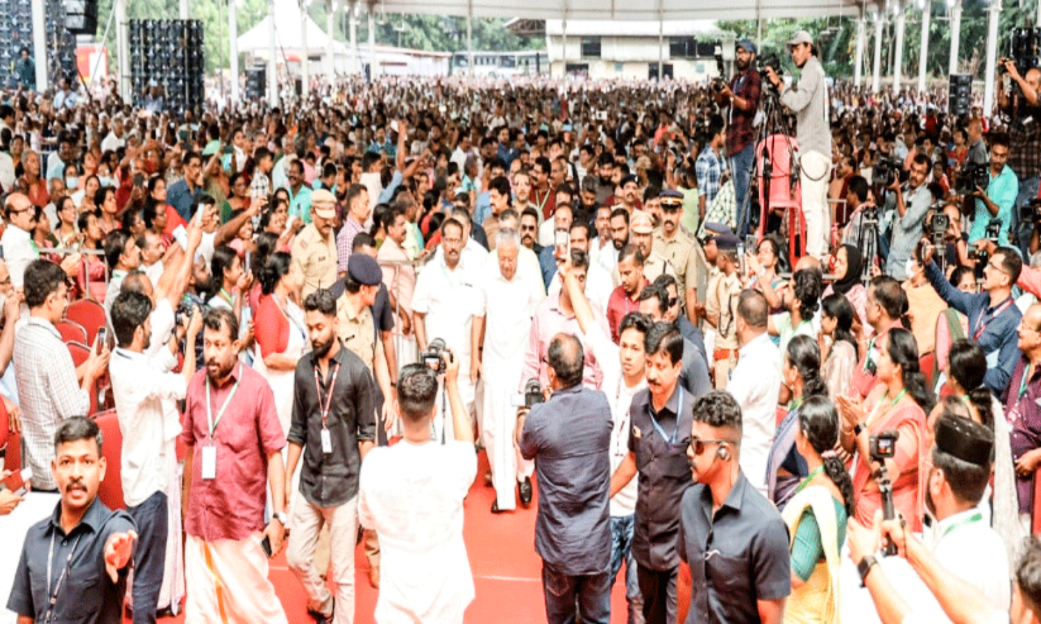 പിറവത്ത് നവകേരള സദസ്സിൽ പങ്കെടുക്കാനെത്തിയ മുഖ്യമന്ത്രി പിണറായി വിജയനെ വേദിയിലേക്ക് ആനയിക്കുന്നു