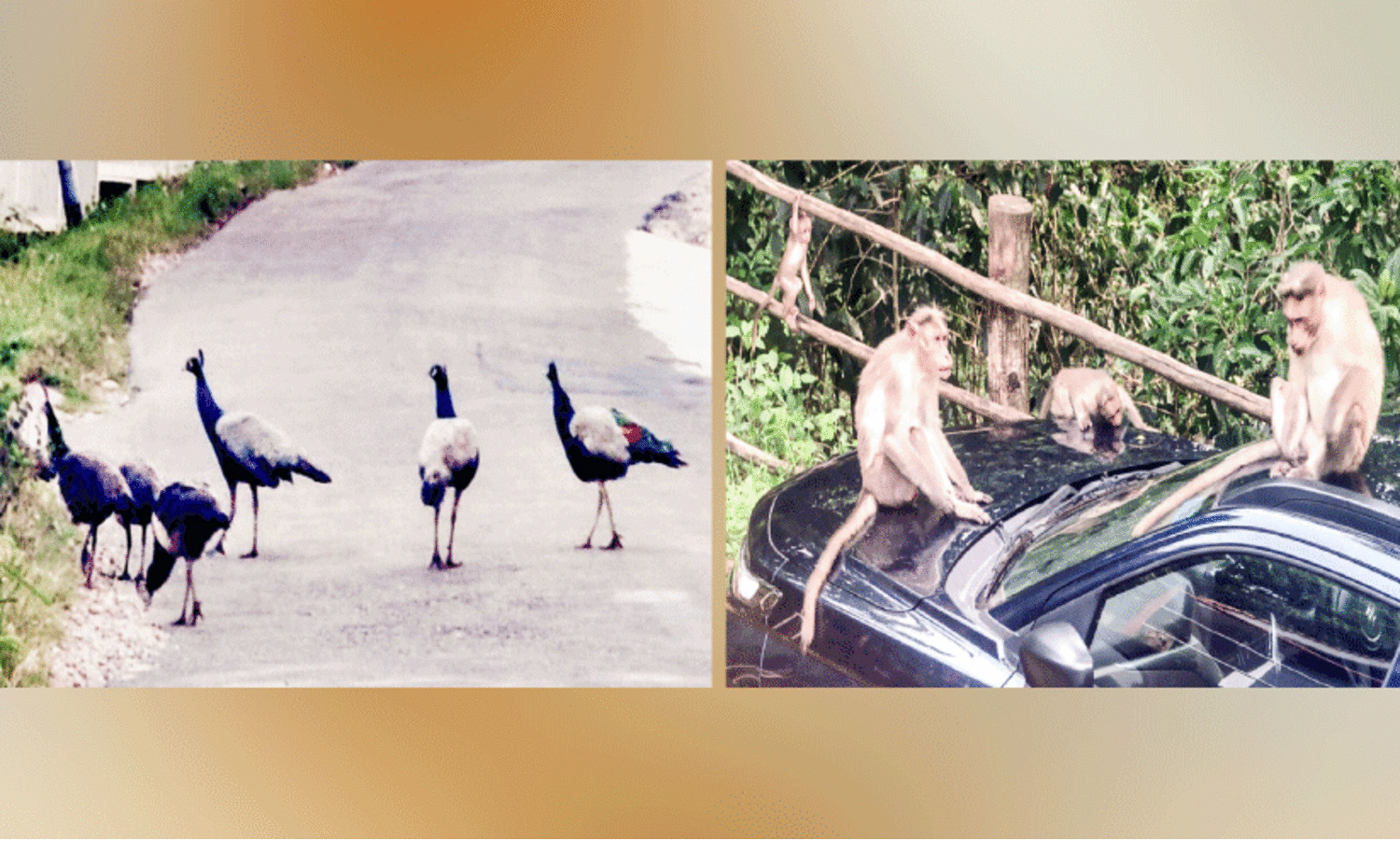 1. മറയൂർ- കാന്തല്ലൂർ റോഡിൽ വെട്ടുകാട് ഭാഗത്ത് കൃഷിയിടത്തിലെത്തിയ മയിലുകൾ 2. മറയൂർ ടൗണിൽ അലഞ്ഞുതിരിയുന്ന കുരങ്ങൻമാർ