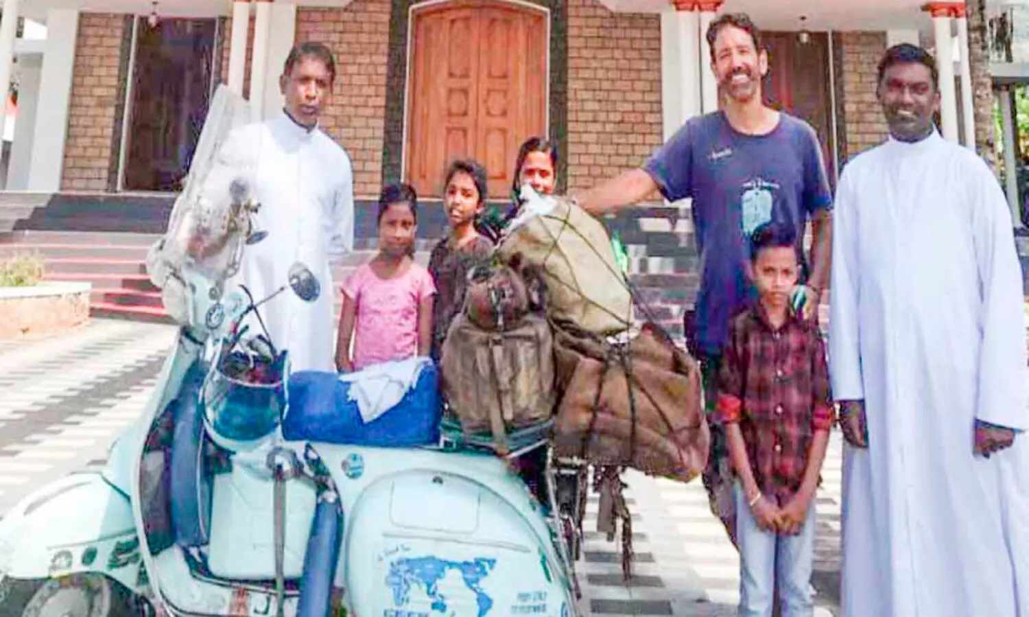 സ്കൂട്ടറില് ലോകം ചുറ്റി സഞ്ചരിക്കുന്ന സഞ്ചാരി ഇലാരിയോ വെസ്പാന്ഡ മറയൂര് സെന്റ് മേരിസ് പള്ളിക്ക് മുന്നിൽ