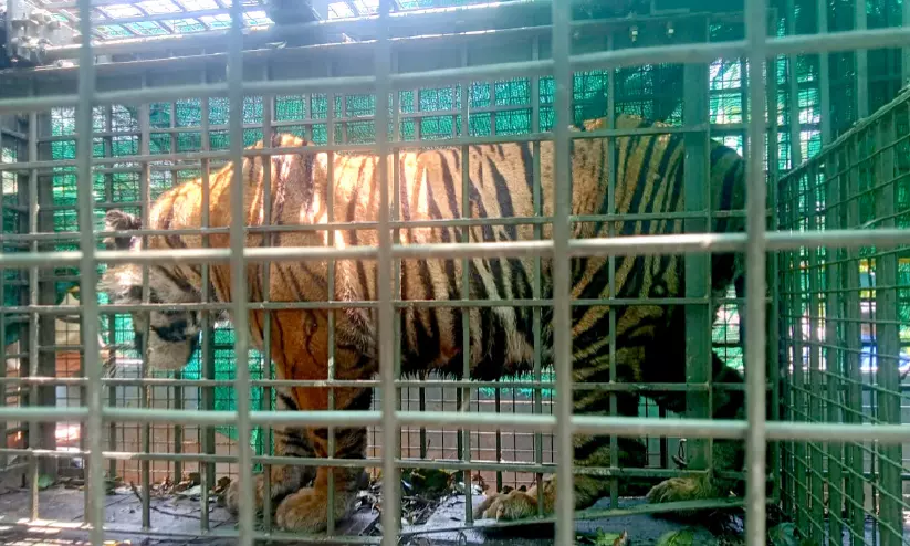 മറയൂർ പാമ്പൻ മലയിൽ വനം വകുപ്പ് സ്ഥാപിച്ച കൂട്ടിൽ അകപ്പെട്ട കടുവ