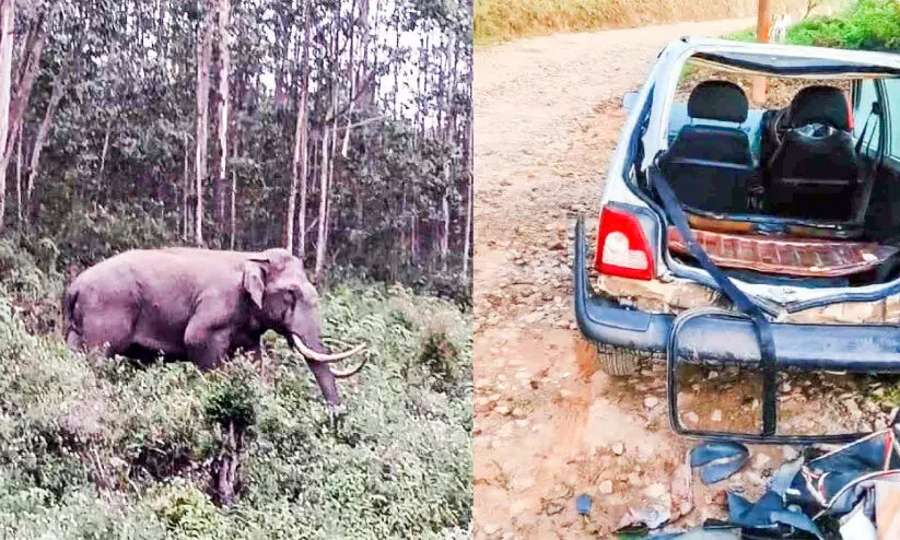 1 , മാട്ടുപ്പെട്ടി ഹൈറേഞ്ച് സ്കൂളിന് സമീപം നിലയുറപ്പിച്ച പടയപ്പ, കാട്ടാന പടയപ്പ തകർത്ത കാർ