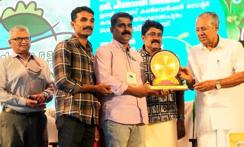 നെറ്റ് സീറോ കാർബൺ പദവി നേടിയ കണ്ണൂർ സെൻട്രൽ ജയിലിനുള്ള പുരസ്കാരം മുഖ്യമന്ത്രി പിണറായി വിജയനിൽ നിന്ന് ഹരിത സ്പർശം കോ ഓർഡിനേറ്റർ ഷിനോജ് എ കെ, അസിസ്റ്റന്റ് പ്രിസൺ ഓഫീസർ ബിജിത്ത് എന്നിവർ ചേർന്ന് ഏറ്റുവാങ്ങുന്നു