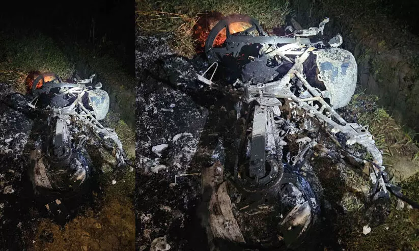 വെളിയമ്പ്ര കൊട്ടാരത്തിൽ വീടിന് മുന്നിൽ നിർത്തിയിട്ട ബൈക്ക് കത്തിനശിച്ച നിലയിൽ