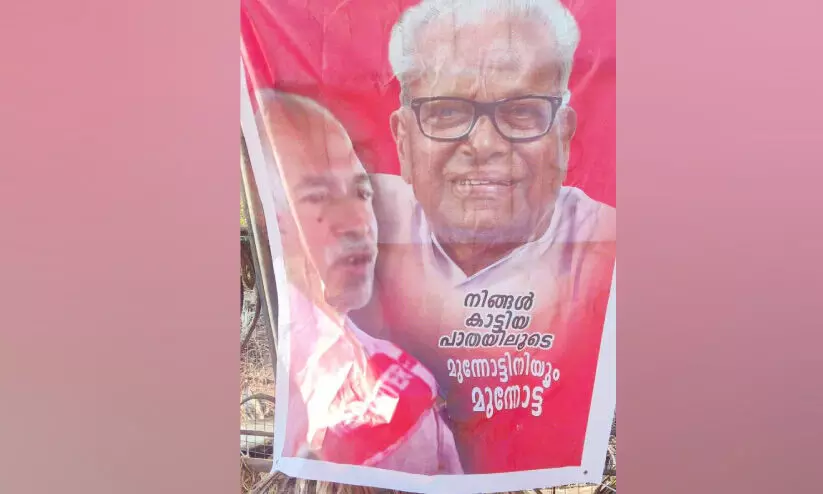 പയ്യന്നൂര് കാരയിലാണ് പോസ്റ്റര് പ്രത്യക്ഷപ്പെട്ടത്. കുഞ്ഞികൃഷ്ണന്റെ ചിത്രത്തിനൊപ്പം വി.എസ്. അച്യുതാനന്ദന്റെ ചിത്രവും പോസ്റ്ററിലുണ്ട്. 'നിങ്ങള് കാട്ടിയ പാതയിലൂടെ മുന്നോട്ടിനിയും മുന്നോട്ട് എന്നാണ്' ഫ്ലക്സില് കുറിച്ചിട്ടുള്ളത്. രക്തസാക്ഷി ഫണ്ട് തിരിമറി ആരോപണം ഉന്നയിച്ചതിന് പിന്നാലെ സി.പി.എം കണ്ണൂര് ജില്ല കമ്മിറ്റി അംഗമായ വി. കുഞ്ഞികൃഷ്ണനെ ഒറ്റുകാരന് എന്നാരോപിച്ച് വ്യാപകമായി ഫ്ലക്സ് ബോര്ഡുകള് സ്ഥാപിച്ചിരുന്നു.