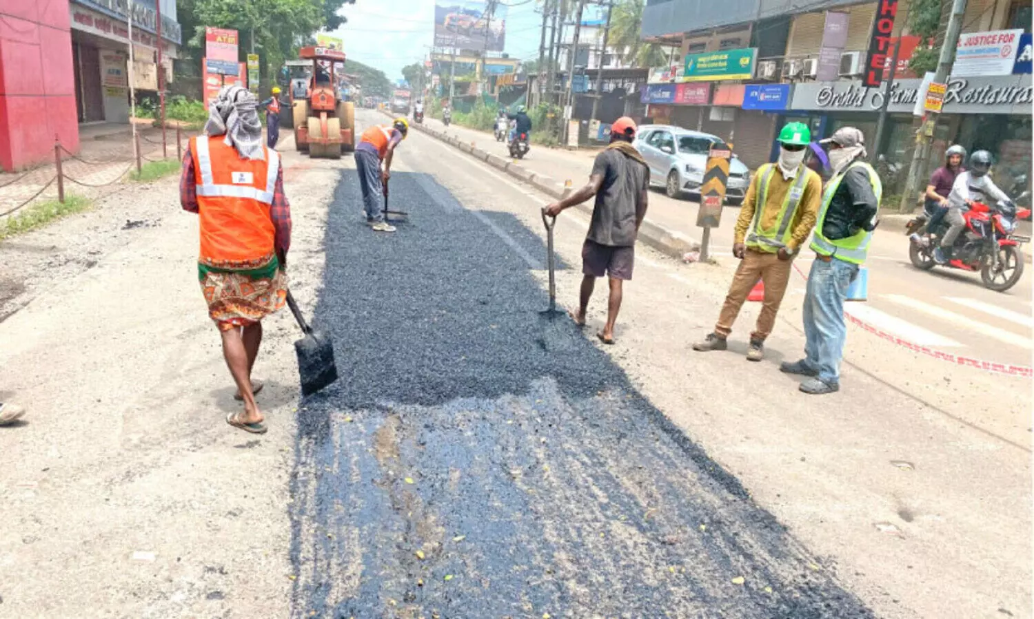 ദേശീയപാതയിൽ പുതിയതെരുവിലെ പൊട്ടിപ്പൊളിഞ്ഞ റോഡുകൾ ടാർ ചെയ്ത് ചെച്ചപ്പെടുത്തുന്നു