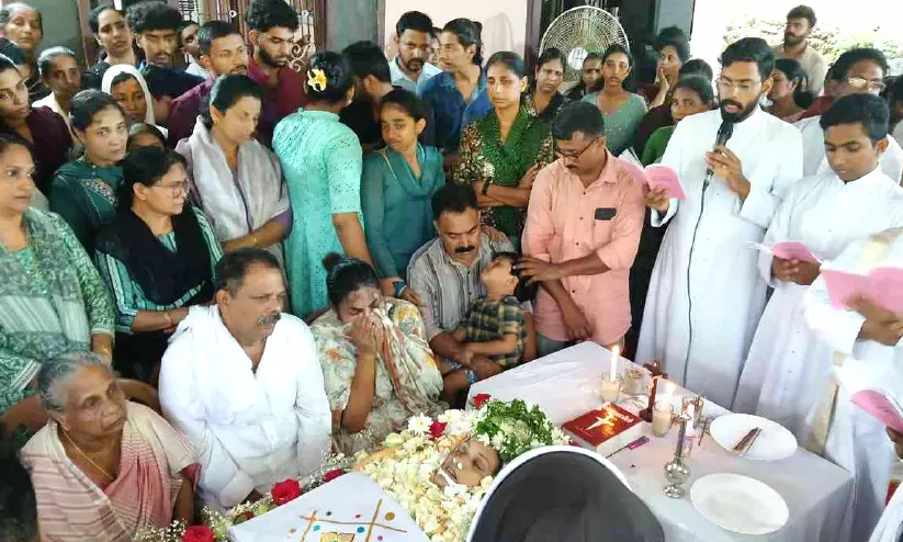 ഗീതമ്മയുടെ മൃതദേഹത്തിൽ അന്ത്യാഞ്ജലി അർപ്പിക്കുന്ന ഭർത്താവ് തങ്കച്ചൻ, മകൾ ജിറ്റി മോൾ, അമ്മ എന്നിവർ