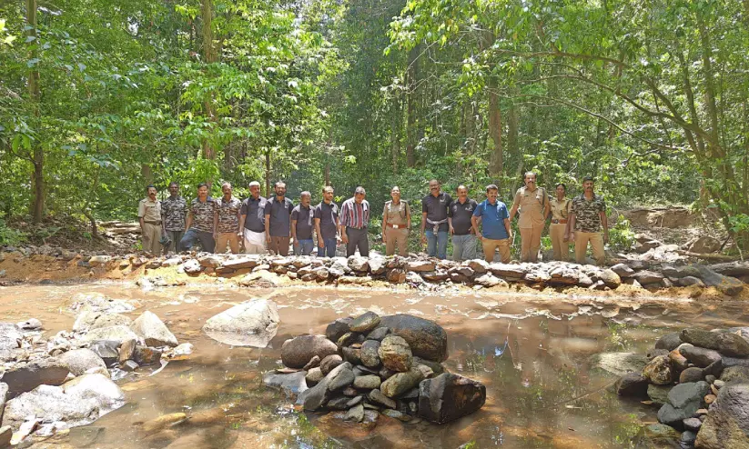 ആറളം വന്യജീവി ജീവനക്കാരും മലബാർ അവയർനസ് ആൻഡ് റെസ്ക്യൂ സെൻറർ ഫോർ വൈൽഡ്ലൈഫ് സന്നദ്ധ സംഘടന പ്രവർത്തകരും ചേർന്ന് ആറളം ശലഭ സങ്കേതത്തിൽ നിർമിച്ച താൽക്കാലിക തടയണ