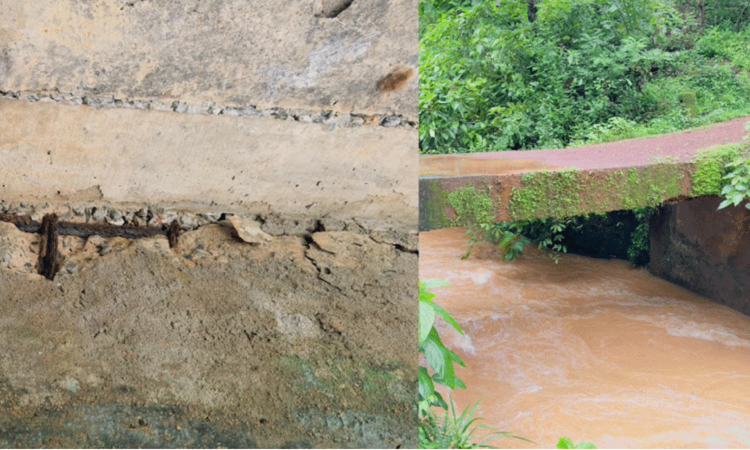 1. ചെണ്ടത്തോടി പാലത്തിന്റെ കമ്പികൾ തുരുമ്പിച്ച് കോൺക്രീറ്റ് അടർന്നുവീണപ്പോൾ 2. ചെണ്ടത്തോടി പാലം വളഞ്ഞ നിലയിൽ