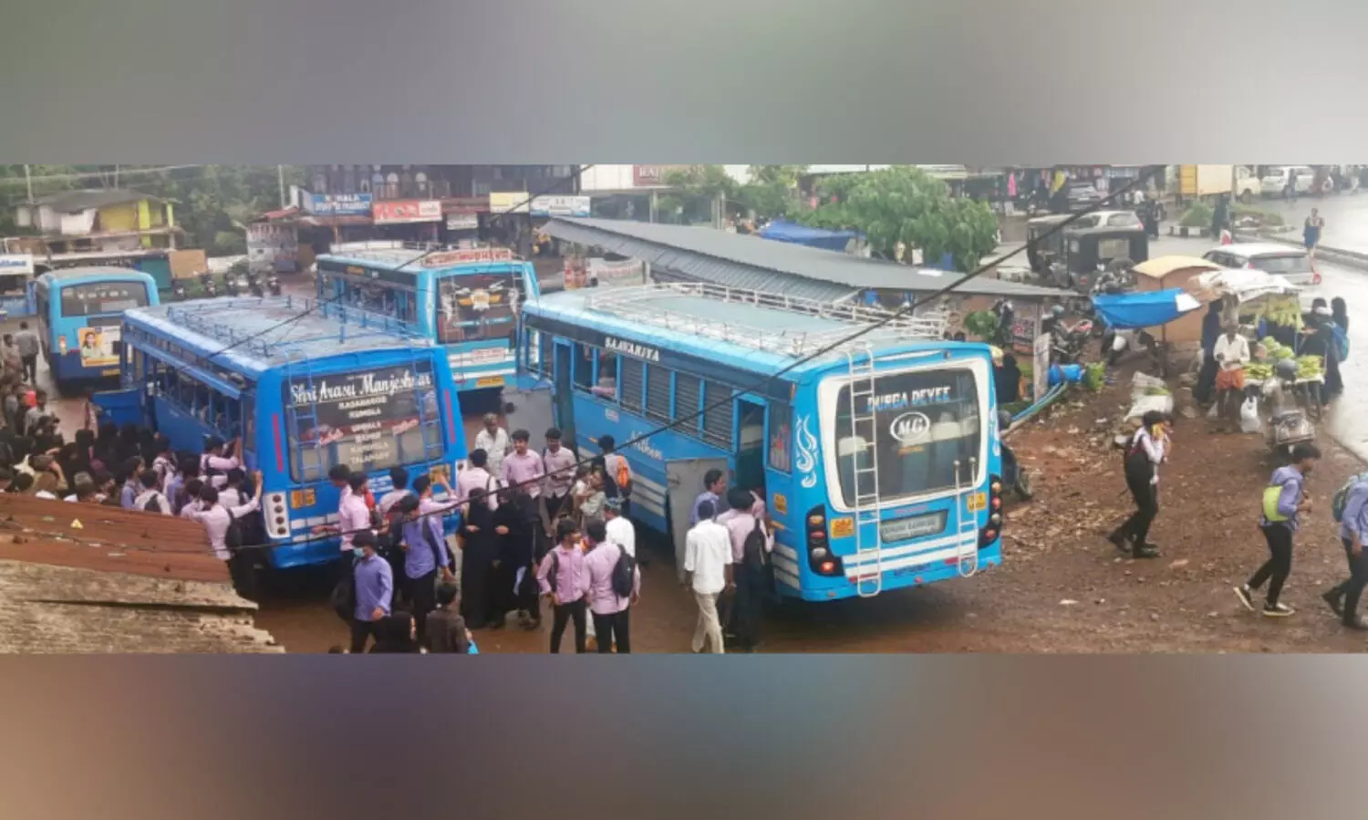 കുമ്പള ടൗണിൽനിന്ന് ബസ് കയറാൻ ബുദ്ധിമുട്ടുന്ന വിദ്യാർഥികൾ