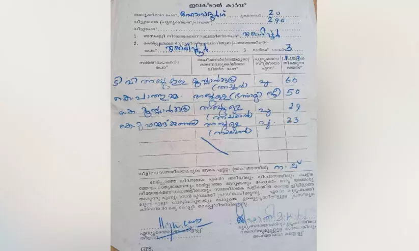 തൃക്കരിപ്പൂർ ചൊവ്വേരിയിലെ ഖാദർ കൂലേരിയുടെ വീട്ടിൽനിന്നാണ് ഇലക്ടറൽ കാർഡ് കണ്ടെത്തിയത്. എൺപതുകളിൽ വോട്ട് ചെയ്ത ഇവർക്ക് 2025ലെ പട്ടികയിൽ പേരുണ്ട്. പക്ഷേ, 2002ലാവട്ടെ കുടുംബം അപ്പാടെ പട്ടികയിലില്ല. അക്കാലത്ത് ആളുടെ പേരും ബന്ധുവിന്റെ പേരും പൂർത്തിയായ വയസ്സും മാത്രമാണ് വോട്ടർപട്ടികയിൽ ഇടംപിടിക്കാൻ വേണ്ടിയിരുന്നത്.