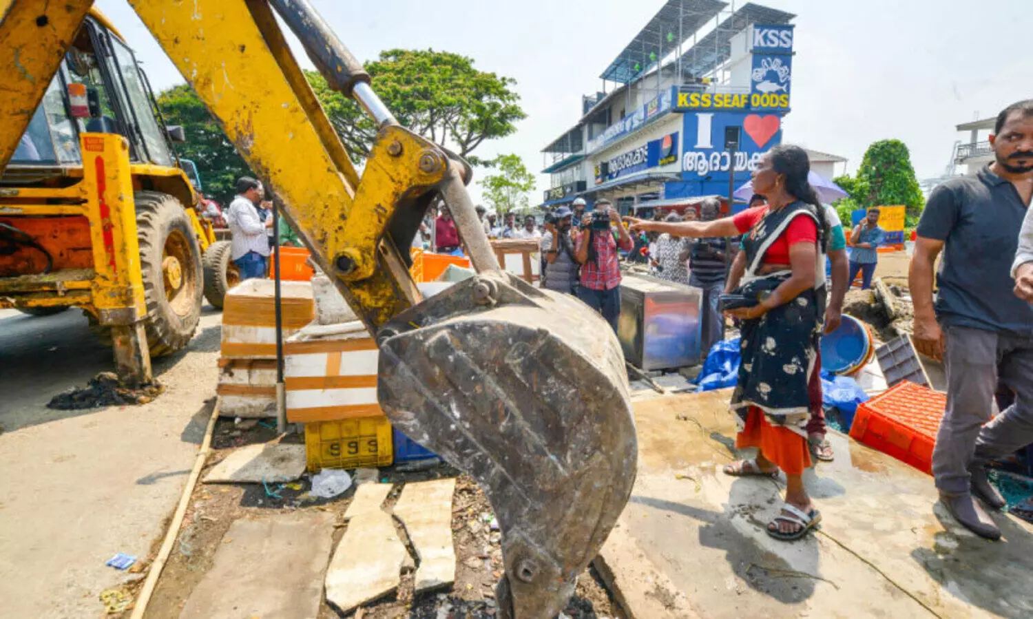 വൈപ്പിൻ കാളമുക്ക് ഹാർബറിൽ ജിഡയുടെ സ്ഥലത്ത് അനധികൃത മീൻ കച്ചവടം നടത്തിയവരെ ഒഴിപ്പിക്കാൻ അധികൃതർ എത്തിയപ്പോൾ മണ്ണുമാന്തി യന്ത്രത്തിന്റെ മുന്നിൽനിന്ന് പ്രതിഷേധിക്കുന്ന കച്ചവടക്കാരി