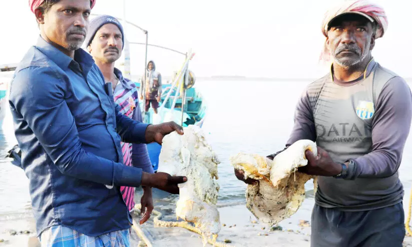 കൊല്ലം ജോനകപുറം ഹാർബറിലെ മത്സ്യത്തൊഴിലാളി അശോക് കുമാറിന് കടലിൽനിന്ന് ലഭിച്ച തിമിംഗല ഛർദി