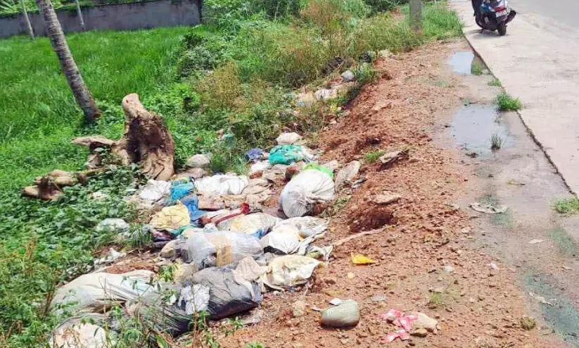 സർവീസ് റോഡിൽ പാലത്തറക്കും മെഡിസിറ്റിക്കും ഇടയിൽ മാലിന്യംതള്ളിയ നിലയിൽ
