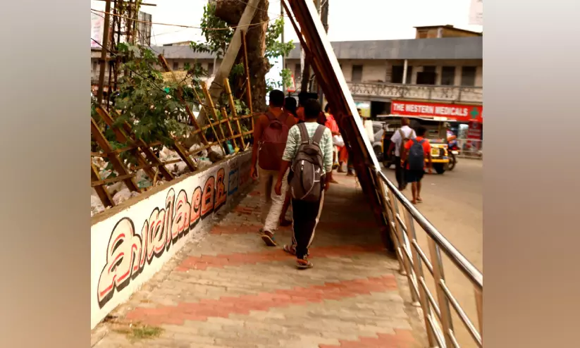 നടപ്പാതകളിൽ ഫ്ലക്സുകൾ സ്ഥാപിക്കുന്നതിനെതിരെ ഹൈകോടതി നിർദേശം ഉൾപ്പെടെ നിലനിൽക്കുകയും കോർപറേഷന് പിഴ ചുമത്താൻ അധികാരം ഉണ്ടായിരിക്കെയുമാണ് കോർപറേഷന്റെ തന്നെ സ്വന്തം കൈവരി ഫ്ലക്സിനൊപ്പം നിലംപൊത്താറായ നിലയിലുള്ളത്.