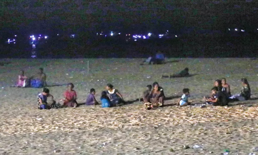 കടുത്ത വേനൽ ചൂടിൽനിന്ന് രക്ഷതേടി രാത്രി കൊല്ലം ബീച്ചിൽ വിശ്രമിക്കുന്നവർ