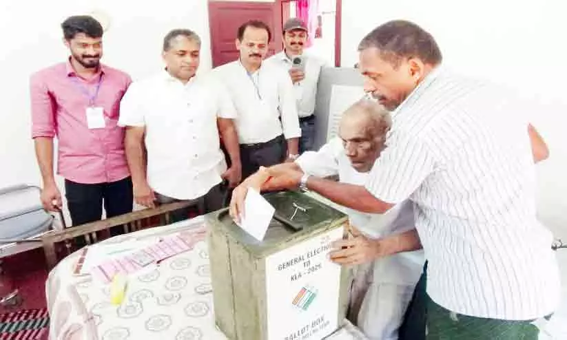 പാലായിലെ ഏറ്റവും മുതിർന്ന വോട്ടറായ 104 വയസ്സ് പിന്നിട്ട മൂലയിൽ തോട്ടത്തിൽ ഔസേപ്പച്ചൻ കടനാട് പഞ്ചായത്തിലെ ആറാം വാർഡിലെ വീട്ടിൽ വോട്ട് രേഖപ്പെടുത്തിയശേഷം ബാലറ്റ് പെട്ടിയിൽ നിക്ഷേപിക്കുന്നു.