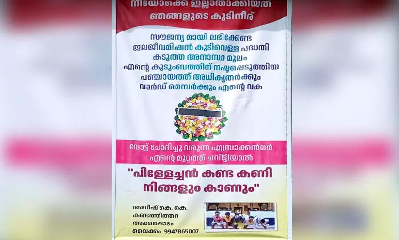 വൈക്കം: ‘‘നീയൊക്കെ ഇല്ലാതാക്കിയത് ഞങ്ങളുടെ കുടിനീര്. വോട്ട് ചോദിച്ച് വരുന്ന എമ്പ്രാക്കൻമാർ എന്റെ വീട്ടുമുറ്റത്ത് ചവിട്ടിയാൽ പിള്ളേച്ചൻ കണ്ട കണി കാണിക്കും’’. വൈക്കം മറവൻതുരുത്ത് പഞ്ചായത്ത് 16ാം വാർഡിൽ ടോൾ ചെമ്മനാകരി റോഡ് സൈഡിൽ താമസിക്കുന്ന കണ്ടത്തിത്തറ അനീഷ് വീടിന്റെ മുൻവശത്തെ ജനലിൽ സ്ഥാപിച്ച ബോർഡിലെ കുറിപ്പാണിത്.