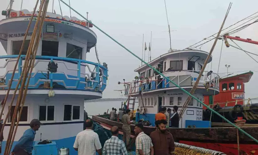 നിയമവിരുദ്ധ മത്സ്യബന്ധനം നടത്തിയതിന് പിടികൂടിയ അന്തർ സംസ്ഥാന ബോട്ടുകൾ