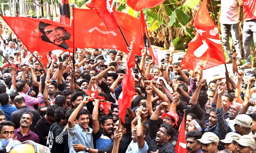 വോട്ടെണ്ണൽ കേന്ദ്രമായ നടക്കാവ് വൊക്കേഷനൽ ഹയർ സെക്കൻഡറി സ്കൂളിന് മുന്നിൽ എൽ.ഡി.എഫ് പ്രവർത്തകരുടെ ആഹ്ലാദം