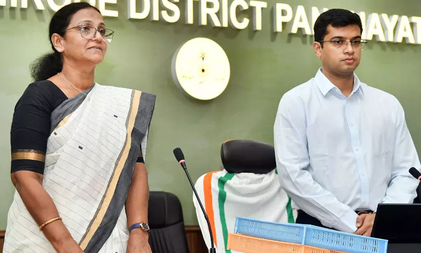 ജില്ല പഞ്ചായത്ത് പ്രസിഡന്റായി തെരഞ്ഞെടുക്കപ്പെട്ട മില്ലി മോഹൻ കലക്ടർ സ്നേഹിൽകുമാർ സിങ് മുമ്പാകെ സത്യപ്രതിജ്ഞ ചെയ്യുന്നു