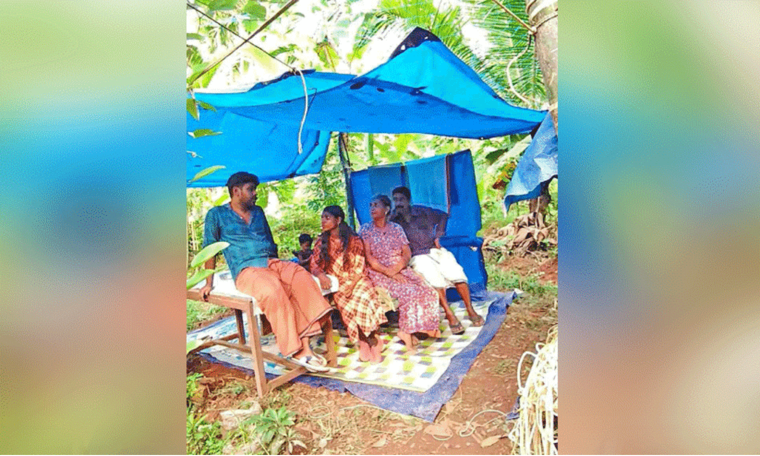 വീട് ജപ്തി ചെയ്തതിനെ തുടർന്ന് പുറത്ത് ടാർപോളിൻ ഷീറ്റിനടിയിൽ കഴിയുന്ന സുകുമാരനും കുടുംബവും