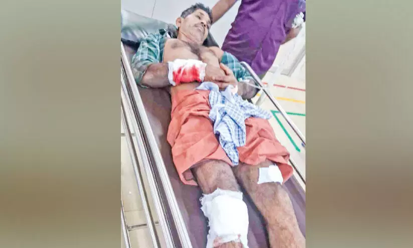 കാട്ടുപന്നിയുടെ ആക്രമണത്തിൽ പരിക്കേറ്റ നെരോത്ത് കൊന്നക്കൽ പണ്ടാരപ്പറമ്പിൽ മോഹനനെ കെ.എം.സി.ടി മെഡിക്കൽ കോളജ് ആശുപത്രിയിൽ പ്രവേശിപ്പിച്ചപ്പോൾ