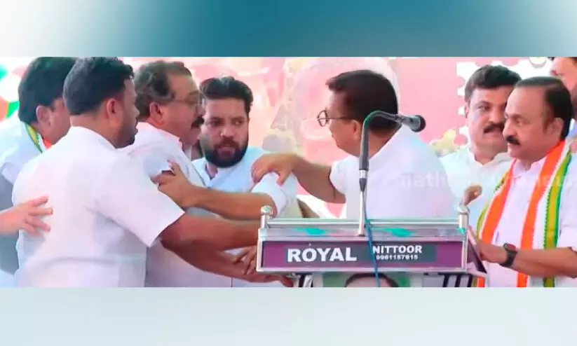 വേദിയിൽ നിന്ന് പിന്മാറാൻ ശ്രമിക്കുന്ന ഷാഫി പറമ്പിൽ എം.പിയെ തടയാൻ ശ്രമിക്കുന്ന അധ്യക്ഷനും മുൻ എം.എൽ.എ പാറക്കൽ അബ്ദുല്ലയും