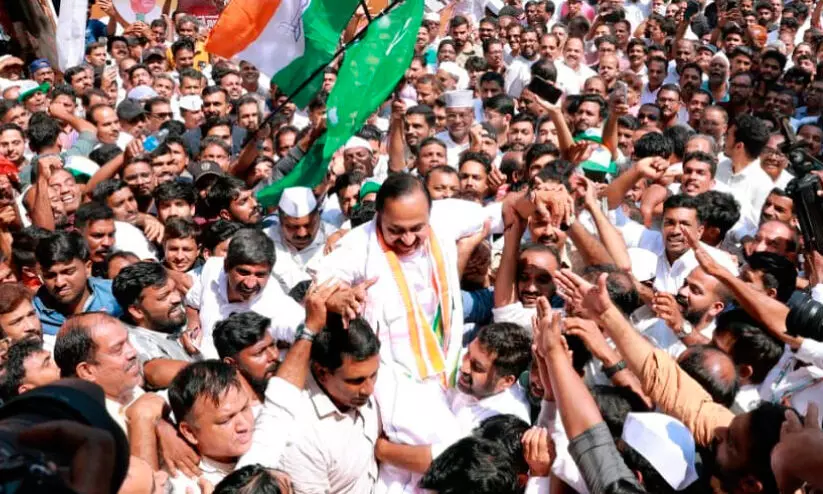 യു.ഡി.എഫ് പുതുയുഗയാത്ര കുറ്റ്യാടിയിൽ എത്തിയപ്പോൾ പ്രതിപക്ഷ നേതാവ് വി.ഡി.സതീശനെ സമ്മേളന വേദിയിലേക്ക് പ്രവർത്തകർ തോളിലേറ്റി കൊണ്ടുവരുന്നു