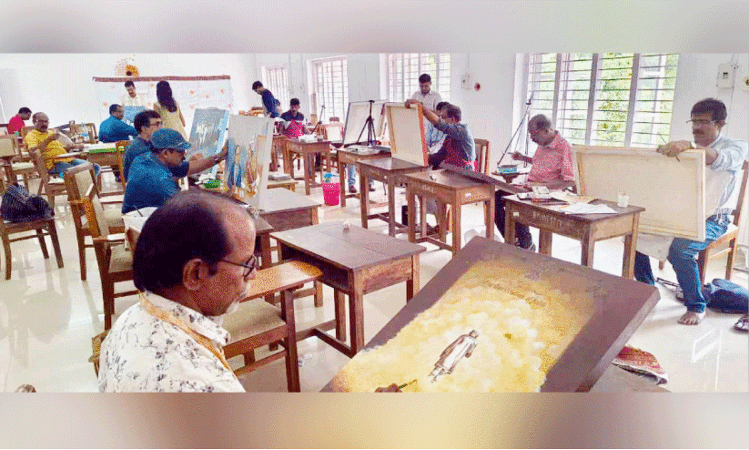സാമൂഹിക പ്രതിബദ്ധതയിലൂന്നിയ ചിത്രകലാ ജീവിതത്തിനിടെയാണ് ശാസ്ത്രയാൻ പരിപാടിയോടനുബന്ധിച്ച് സർവകലാശാല ക്യാമ്പസിലേക്കുള്ള വരവ്. സർവകലാശാല ചരിത്രവിഭാഗം അധ്യാപകനും പാഠപുസ്തക സമിതി ചെയർമാനുമായ ഡോ. പി. ശിവദാസന് ചിത്രകാരൻ സുരേഷ് കാട്ടിലങ്ങാടിയുമായുള്ള സൗഹൃദമാണ് പുതിയ സർഗ്ഗസൃഷ്ടികൾക്കിടയാക്കിയത്. ബാലകൃഷ്ണൻ കതിരൂരാണ് നിലവിൽ 28 കലാകാരൻമാരുള്ള കൂട്ടായ്മയുടെ കൺവീനർ. എം.ടിയുടെ കഥകളും നോവലുകളും ആസ്പദമാക്കി കോഴിക്കോട് അടുത്ത ക്യാമ്പ് നടത്താനുള്ള ഒരുക്കത്തിലാണിവർ. ചിത്രകലാ അധ്യാപകരിൽ ജോലിയിലുളളവരും വിരമിച്ചവരുമുണ്ട്. ചിത്രങ്ങൾ സർവകലാശാല കാമ്പസിൽ നടക്കുന്ന ശാസ്ത്രയാൻ പരിപാടിയിൽ പ്രദർശിപ്പിക്കും.