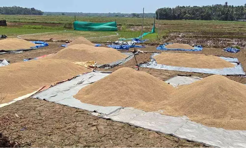 കോൾ പ്രദേശത്ത് സംഭരണത്തിനായി കൂട്ടിയിട്ട നെല്ല്