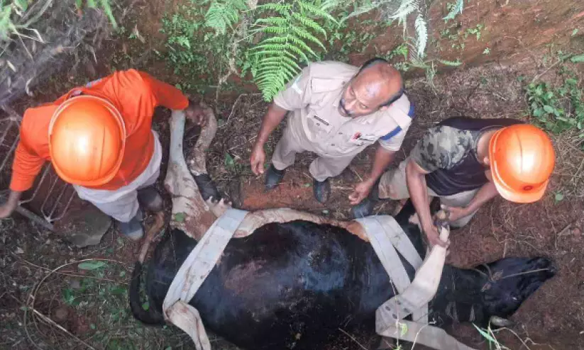 പശുവിനെ അഗ്നിരക്ഷാസേന അംഗങ്ങൾ രക്ഷപ്പെടുത്തുന്നു
